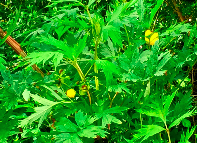 This unknown medium high, deciduous shrub with large yellow ball shaped flowers appeared in the garden in May. We eventually identified it as Ludlow’s tree peony, endemic to south-east Tibet, where it is called lumaidao meaning ‘God’s flower’.