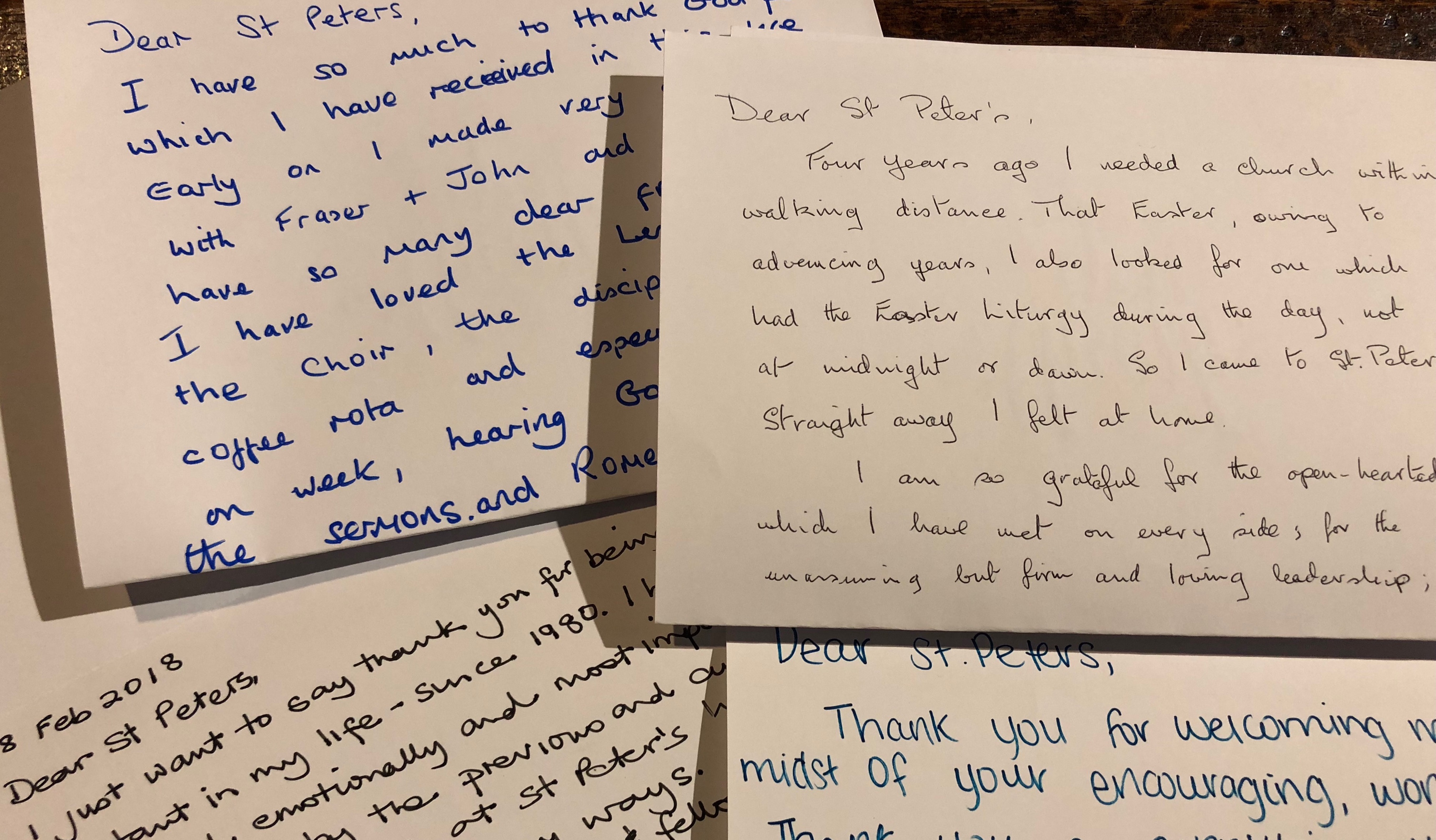 At the end of the workshop we were each invited to write a thank you card to St Peter’s. Some people chose to take their cards home with them. But others were willing to place them on a line behind the altar, as testimonies to all the love given and received in this place.